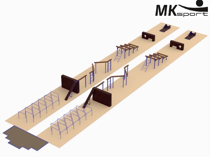 Укомплектованная и готовая к установке полоса препятствий сразу для двух участников соревнований. Каждая из полос включает ров, лабиринт, забор с наклонной доской, разрушенный мост, разрушенную лестницу, стенку с двумя проломами и одиночный окоп. Основа каждого из элементов – металлокаркас из профильных труб 80*80*3, 60*30*2, 40*40*2, 40*25*2, 42*3, 32*3 мм. Обшивка элементов производится влагостойкой ламинированной фанерой 9 мм. Брусья 140*140 мм покрыты дополнительным слоем защитно-декоративного состава. Стандартный цвет каркаса синий.