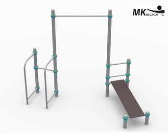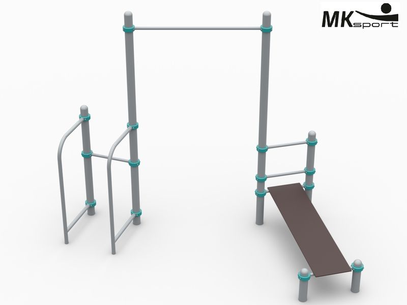 Компактный, но в то же время многофункциональный воркаут-комплекс предназначен для установки на спортивных площадках и во дворах. Он включает в себя три снаряда: брусья для отжиманий, турник для подтягиваний и скамью для пресса. Для производства каркаса используются стальные трубы 89*3 и 32*3 мм. Скамья изготовлена из влагостойкой ламинированной фанеры. Для удобства выполнения упражнений предусмотрена перекладина для хвата. Стандартный цвет оборудования – серо-бирюзовый.